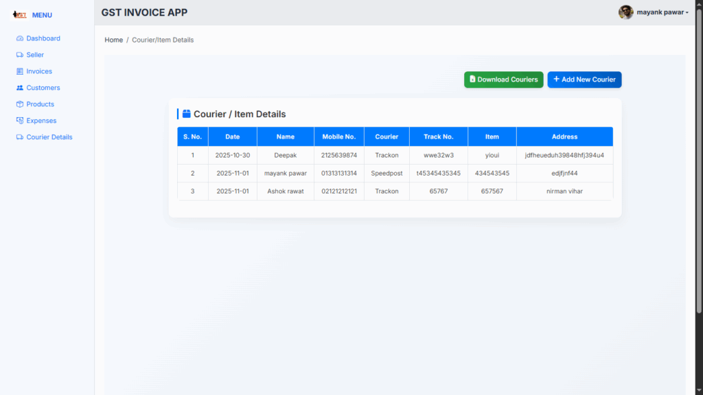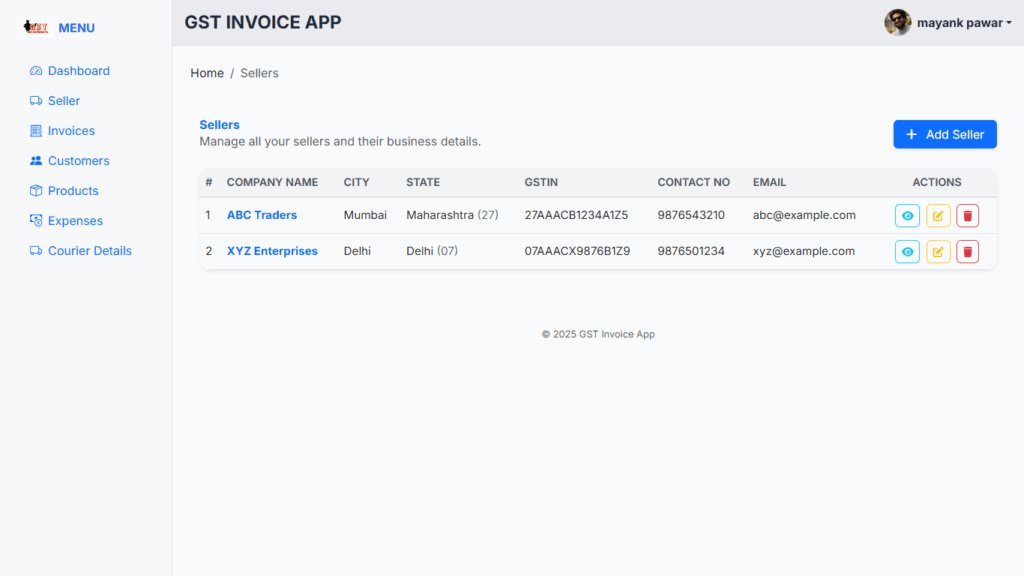 Maintain GSTIN, ledger history, pending payments, and full transaction details.